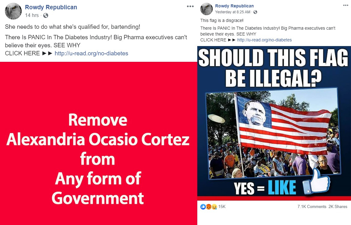 The Rowdy Republican Facebook page is not, on the surface, about diabetes. Instead, it traffics in provocative conservative memes to attract engagement, which on Facebook means likes, comments, and shares. Posts that get more engagement on Facebook are rewarded with increased distribution.