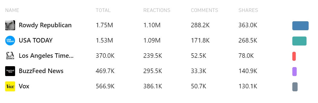 The Rowdy Republican page has been able to outperform USA Today, even though USA Today has over 8 million followers, more than ten times the Rowdy Republican's following of 780,000. Over the last 30 days, the Rowdy Republican page also has outperformed the Los Angeles Times (2.76 million followers), another of the nation's largest newspapers, and prominent digital outlets like BuzzFeed News (3.02 million) and Vox (2.43 million).