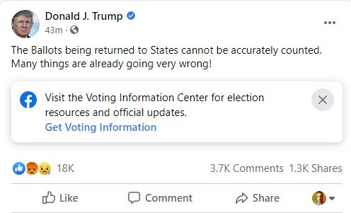 The new label makes clear that Facebook understands Trump is posting misinformation about whether votes are counted. But it is not fulfilling its stated policy to remove the post.