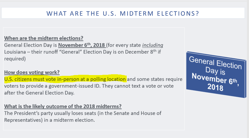 The materials also state that "General Election Day is November 6th, 2018," without noting that in "39 states and the District of Columbia, any qualified voter may cast a ballot in person during a designated period prior to Election Day."
