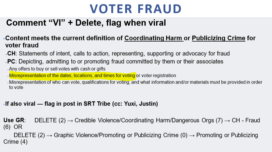 This misinformation was provided to content moderators who were tasked with deciding what kind of voting information to delete from Facebook. The presentation instructed Cognizant content moderators to delete "misrepresentation of the dates, locations, and times for voting."