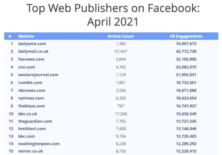 The Daily Wire, for example, is a sexist, xenophobic, and bigoted far-right website that produces no original reporting. But, on Facebook in April, The Daily Wire received more than double the distribution of the Washington Post and the New York Times combined:
