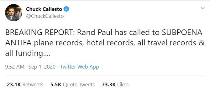 Callesto is not a journalist — he describes himself as a "Digital Real Estate Manager" — and there is no indication that Rand Paul said anything about this on Tuesday. Regardless, Antifa is not an actual organization. That didn't stop the tweet from being retweeted 23,000 times in less than 8 hours. Images of the tweet are also circulating widely on Facebook.