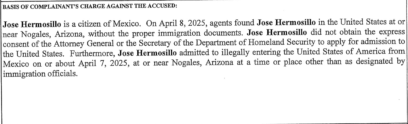 Court documents obtained by Danyelle Khmara of AZPM say that Hermosillo was detained "at or near Nogales, Arizona" and that he admitted he was not a citizen.