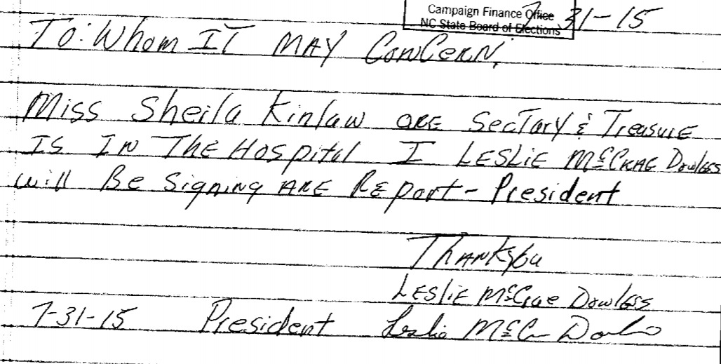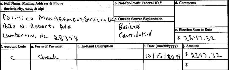 The first donation to Patriots for Progress came from Landon Bordeaux, the current president of the Bladen County GOP. Another early donation came from Politico Management Services LLC, a political consulting firm.