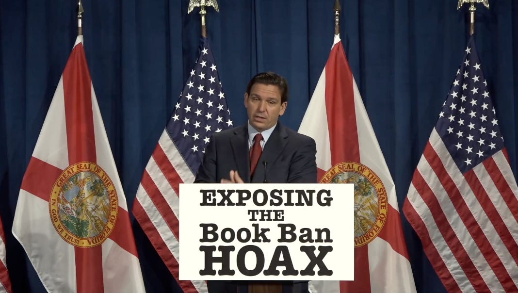 At the event, DeSantis also distributed a fact sheet about the "book ban hoax." Nearly everything on the fact sheet is false.