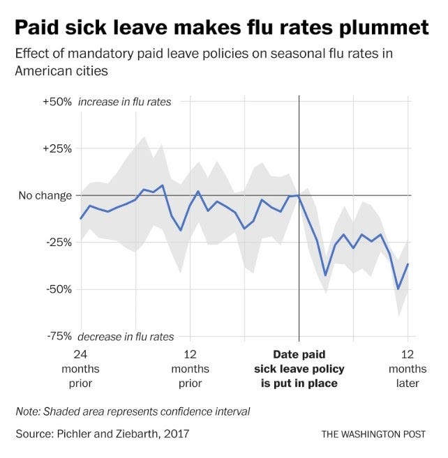 A 2012 study found "the lack of workplace policies such as paid sick leave led to 5 [million] extra flu-like illnesses during the H1N1 swine flu outbreak of 2009." A 2018 study found that, in cities that implement mandatory paid sick leave, flu rates plummet by nearly 50%.