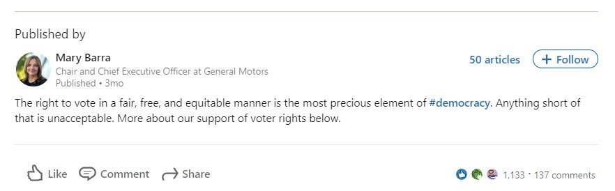 On April 6, General Motors CEO Mary Barra wrote on LinkedIn that the "right to vote in a fair, free, and equitable manner is the most precious element of #democracy." Barra then expounded at length on GM's "support of voter rights."