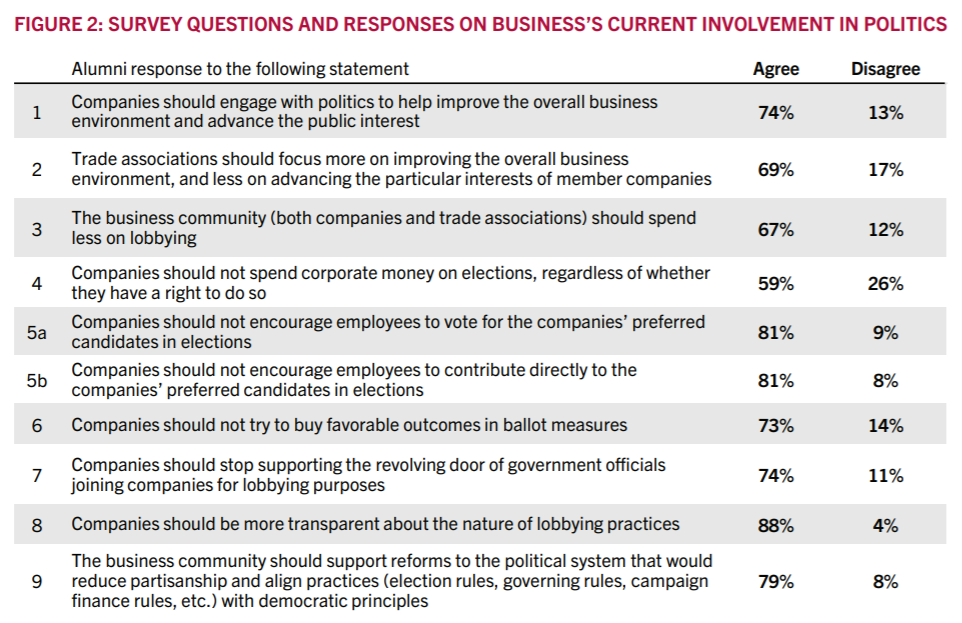 The Harvard study found a surprising willingness among HBS alumni to change the corporate political playbook. A strong majority of HBS alumni believe corporations should end political donations, spend less on lobbying, and stop trying to buy outcomes in ballot initiatives.