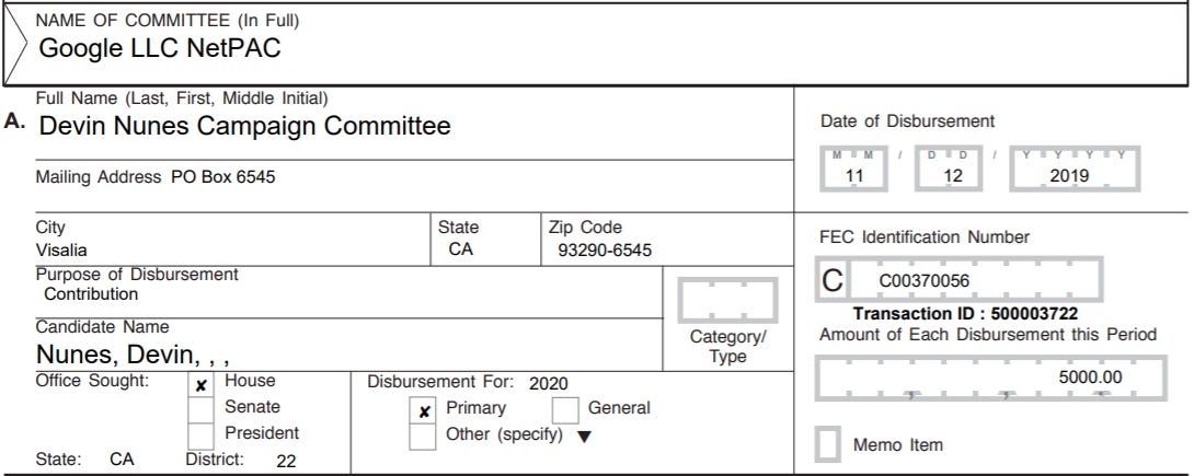 In response, Google quietly rewarded Nunes' behavior with a check for $5000 to help him get reelected. The donation was revealed in a little-noticed FEC report that was filed on December 20.