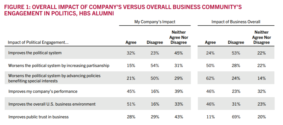 But when asked about corporate involvement in politics generally, most HBS alumni agree that corporate political donations are deleterious and warp democracy.
