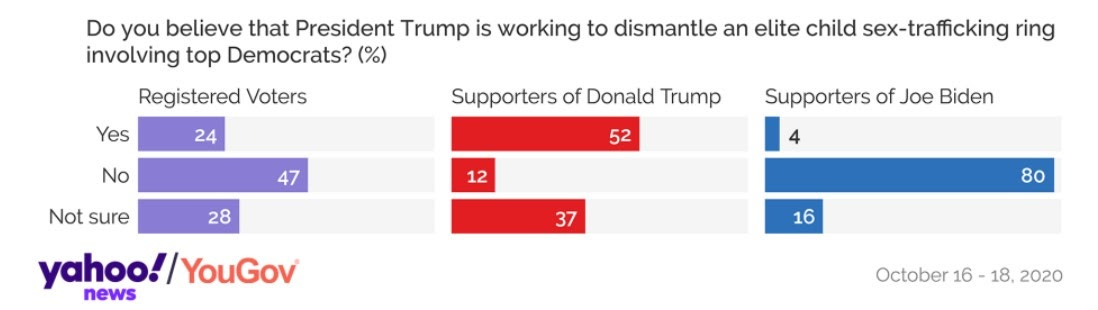 A YouGov survey from October 16-18 measured how many Trump supporters accepted the main tenet of QAnon, whether or not they were aware of the name of the conspiracy. That poll found that 52% of Trump supporters believe "President Trump is working to dismantle an elite child-sex trafficking ring involving top Democrats." Just 12% of Trump supporters reject that notion as false.