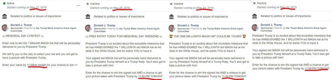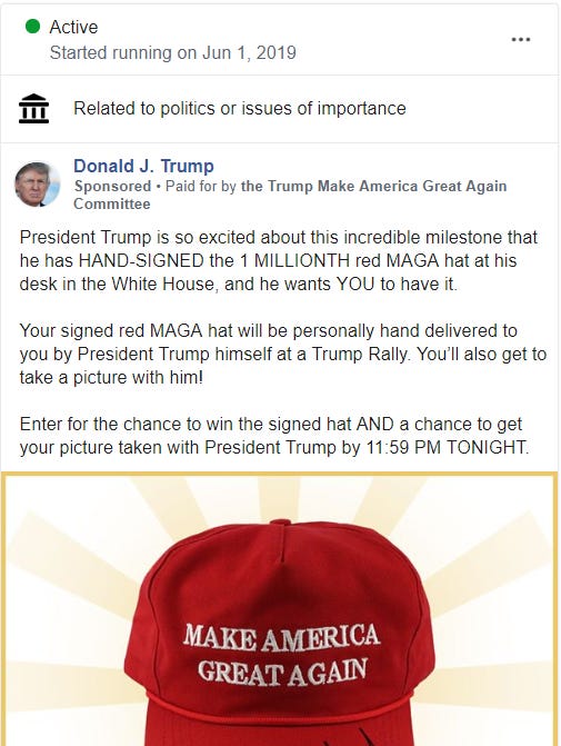 Last Tuesday, Popular Information reported on a simple scam that the Trump campaign is running on Facebook. The campaign is telling supporters that it must enter by midnight to have a chance at winning the 1,000,000th MAGA hat signed by Trump. The next day, it runs the same ad.