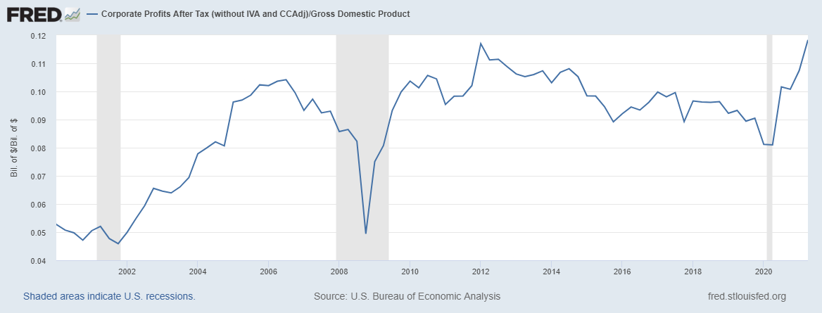 As a result, their net margin -- which measures how much profit companies are squeezing from their revenue -- has risen to a record high, according to Bank of America Corp....“To a fundamental analyst, inflation is called ‘pricing power,’” said Nicholas Colas, co-founder of DataTrek Research. “And it is very good for incremental corporate earnings.”