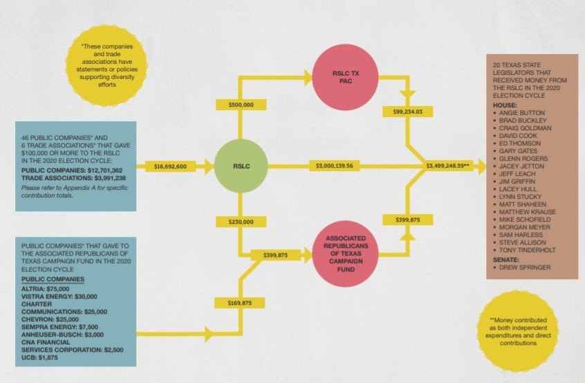 Money sent to the RSLC is also funneled directly to candidates. In 2020, for example, 46 public companies and 6 trade organizations gave a combined $16,692,600 to the RSLC. With that money, the RSLC sent $891,000 to its subsidiary, the RSLC Georgia PAC. In turn, the RSLC Georgia PAC gave $86,800 directly to members of the Georgia legislature who supported the voter suppression bill. The RSLC Georgia PAC also gave $450,000 to the Georgia House Republican Trust, which spends money to elect Republicans to the Georgia House. The Georgia House Republican Trust gave another $50,000 to individual members of the Georgia legislature who supported its voter suppression legislation.