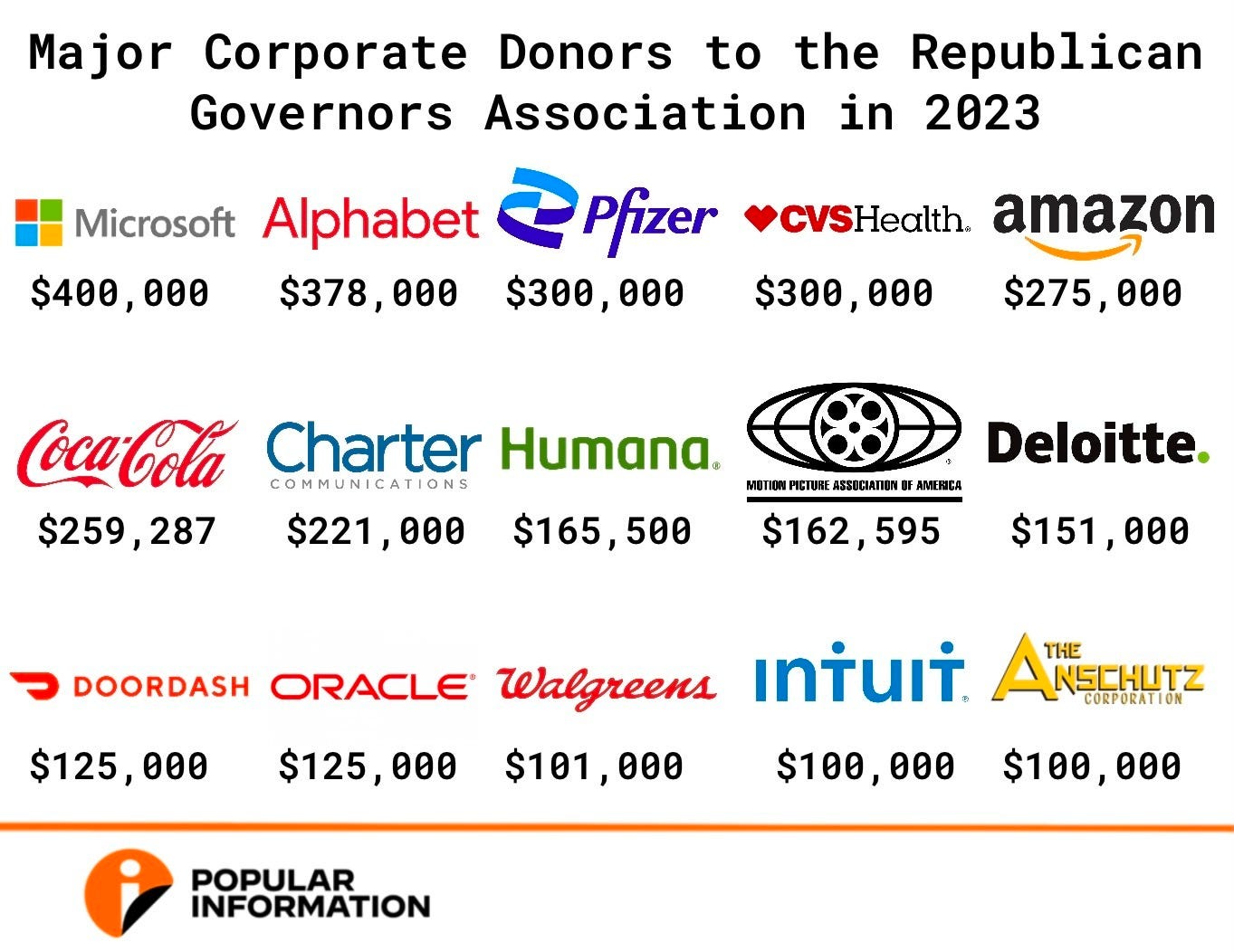 Many of the nation's most prominent corporations have donated 6-figure sums to the RGA — money that can and will be used to help Robinson's win. Major corporate donors to the RGA in 2023 included Microsoft ($400,000), Alphabet (Google’s parent company) ($378,000), CVS ($300,000), Pfizer ($300,000), Amazon ($275,000), Coca-Cola ($259,287), Deloitte ($151,000), and DoorDash ($125,000).