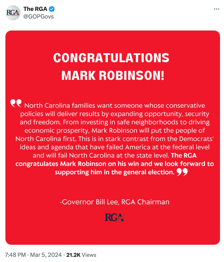 Tuesday night, shortly after Robinson was declared the winner of the Republican gubernatorial primary, the Republican Governors Association posted their congratulations and said, "[W]e look forward to supporting him in the general election."