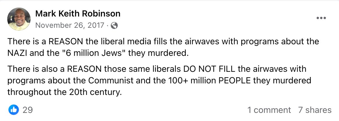 Robinson’s post was not an isolated incident. “There is a REASON the liberal media fills the airwaves with programs about the NAZI and the ‘6 million Jews’ they murdered,” Robinson wrote on Facebook in 2017. The post is notable for the use of scare quotes around "6 million Jews," suggesting doubts about whether the Holocaust actually happened. Robinson does not use quotes when discussing the millions killed by Communist regimes.