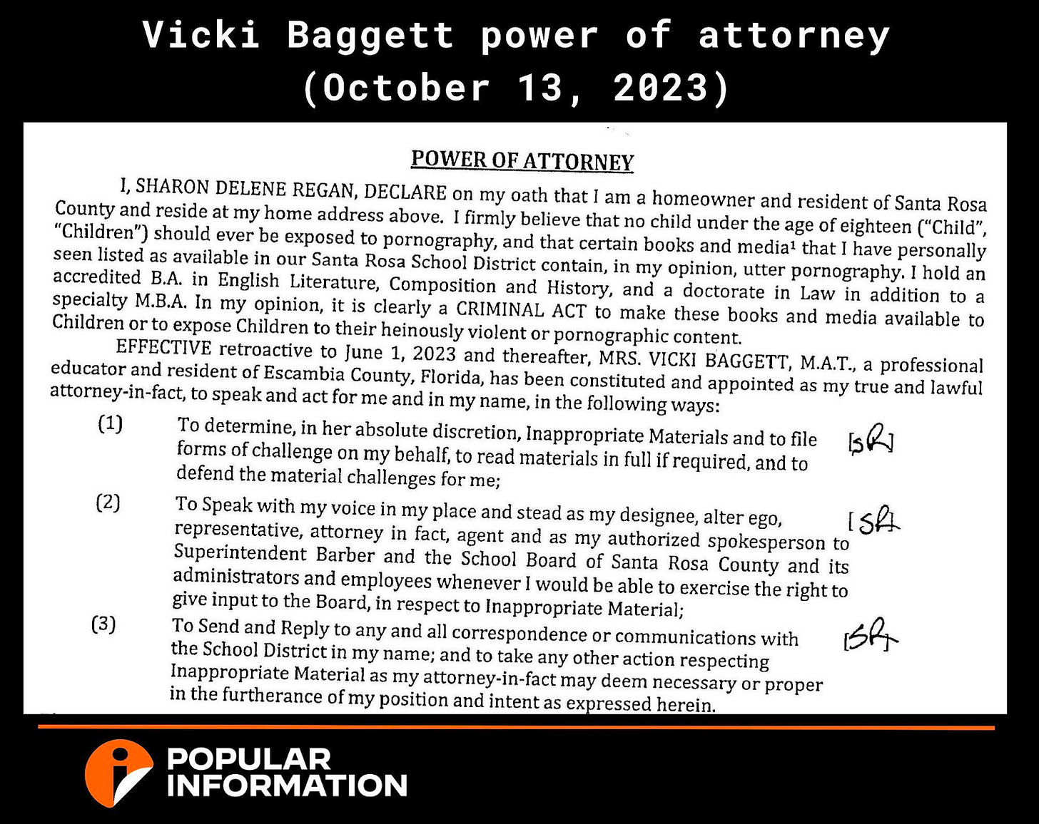 On October 13, Baggett obtained a power of attorney from a county parent to submit book challenges on her behalf. The document, signed by Sharon Regan, declares that Regan has "personally seen [books] listed as available in our Santa Rosa School District [that] contain, in my opinion, utter pornography." Regan also declares that "it is clearly a CRIMINAL ACT to make these books and media available to Children or to expose Children to their heinously violent or pornographic content."