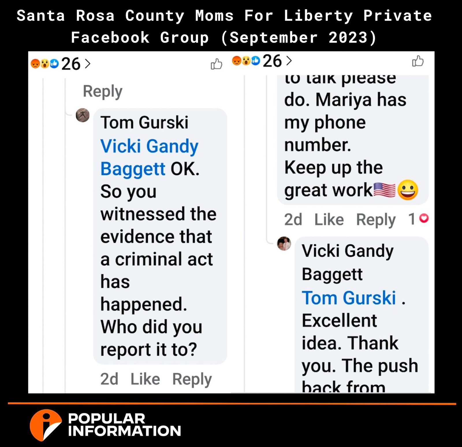 Popular Information has obtained screenshots from the private Santa Rosa County Moms for Liberty Facebook group. In messages sent to the group at the start of the school year, Gurski and Baggett discuss filing reports with law enforcement about public library books.
