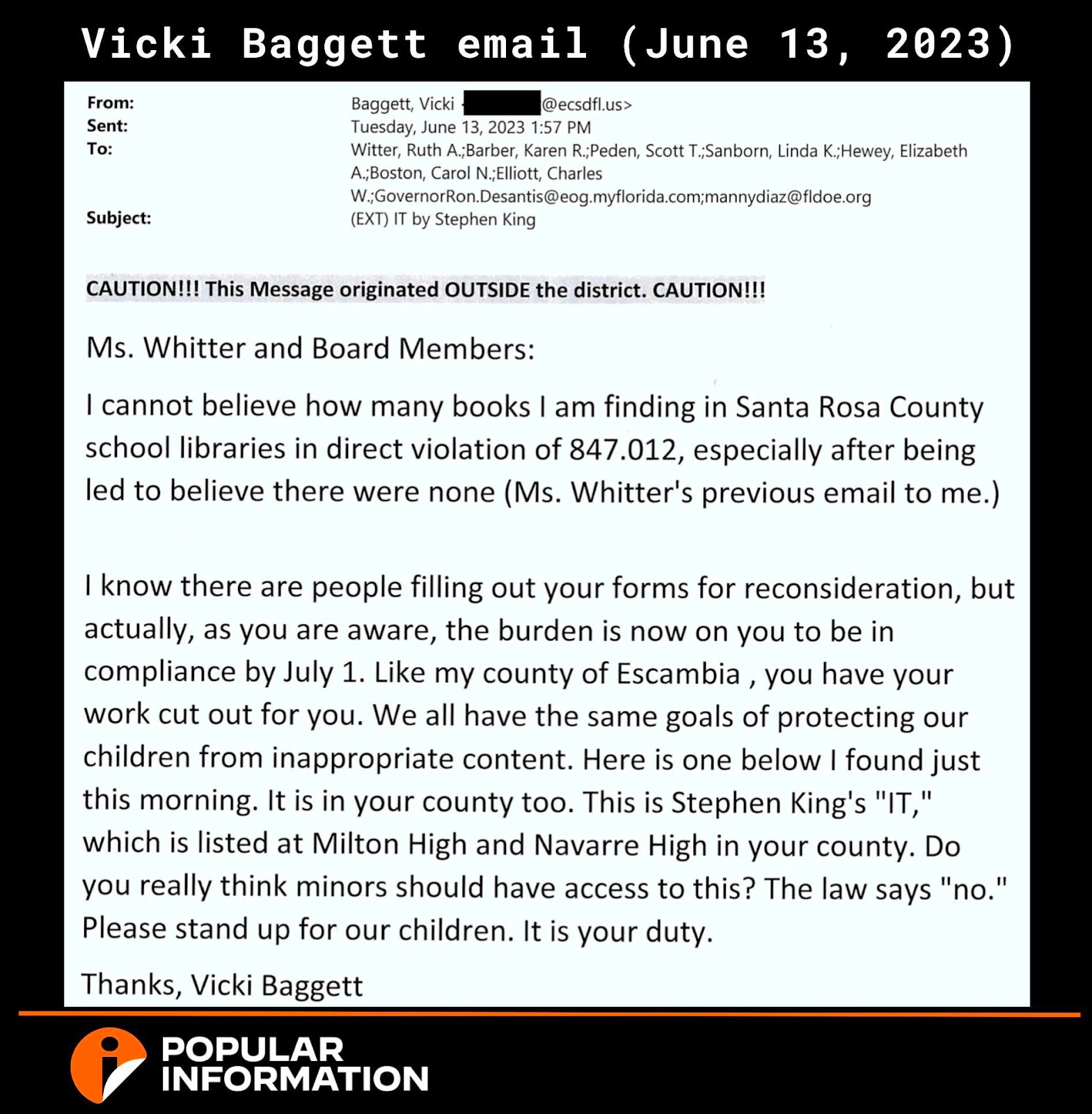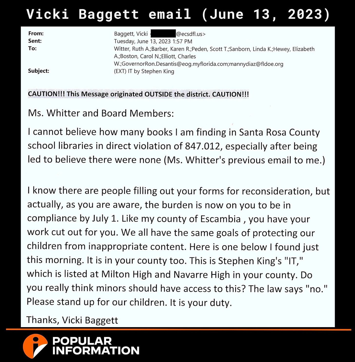 On June 13, 2023, Baggett sent an email from her Escambia County School District account to Witter and Karen Barber, Santa Rosa County's superintendent, copying Governor Ron DeSantis (R) and Education Commissioner Manny Diaz (R). In the email, she accused Witter of violating the state's pornography laws because there was a Stephen King novel in Santa Rosa school libraries.