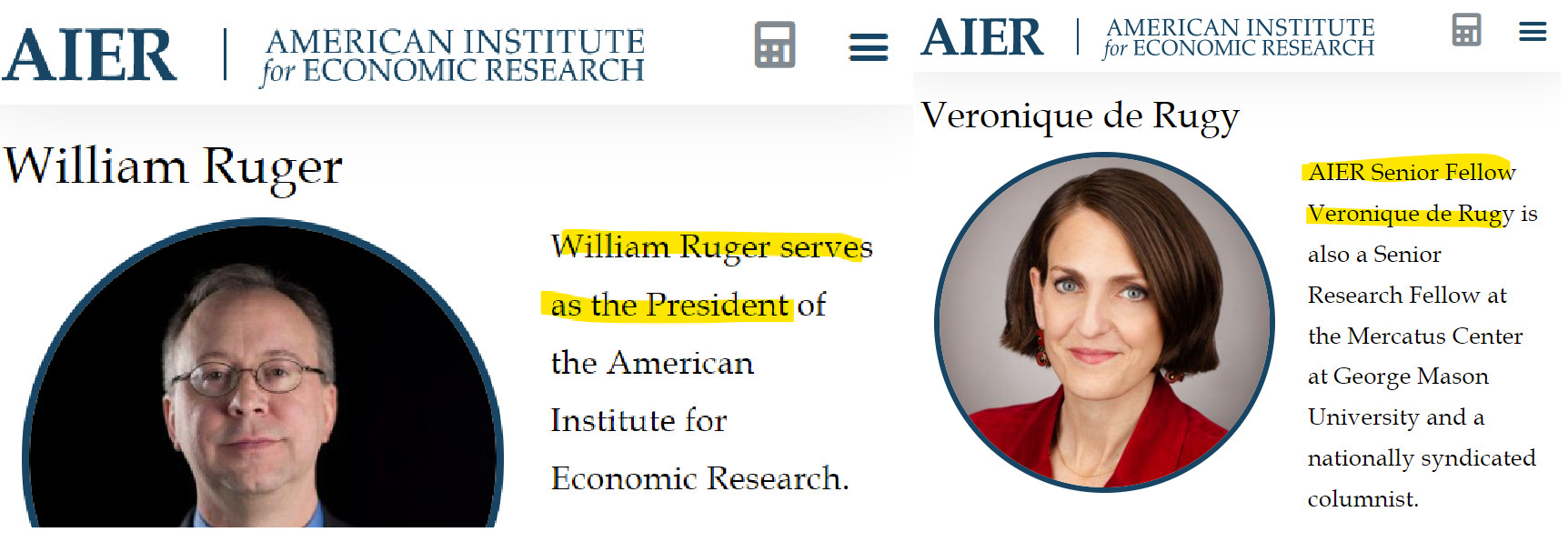 What De Rugy did not reveal is that her primary employer George Mason University, has received more than $120 million from the Charles Koch Foundation between 2015 and 2020. She does also not reveal that her secondary employer, the American Institute for Economic Research (AIER) — which has received a much smaller amount of funding from the Charles Koch Foundation — is run by Will Ruger.