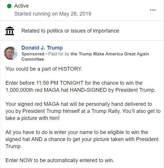 Today, March 28, the Trump campaign is running dozens of ads promoting a contest: "Enter before 11:59PM TONIGHT for the chance to win the 1,000,000th red MAGA hat HAND-SIGNED by President Trump."