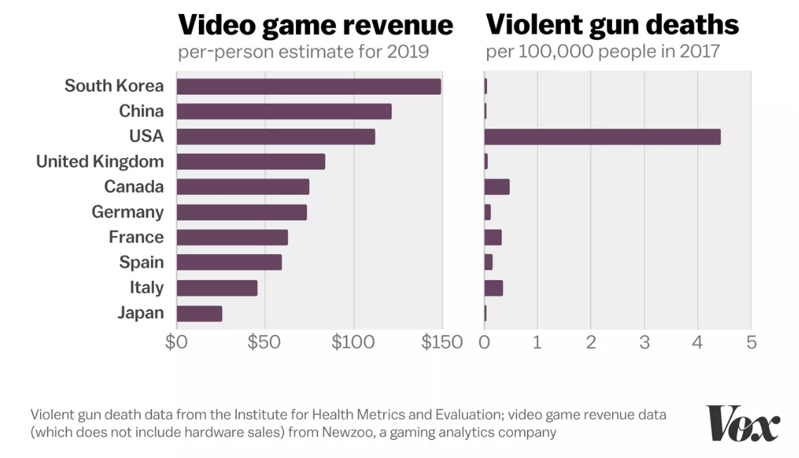But, as Vox notes, people spend the most money on video games in South Korea and China -- two places where the rate of violent gun death is very low.