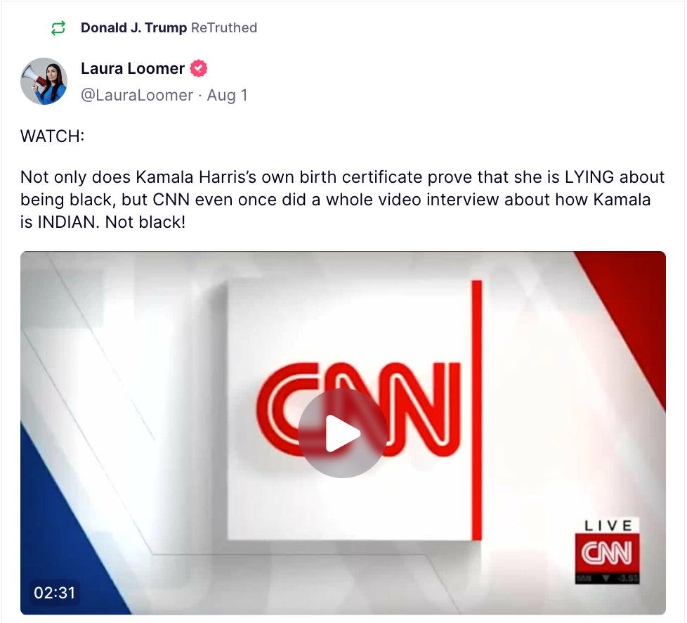 Three days later, Trump posted Loomer’s graphic to his Truth Social account. (Loomer told the Washington Post that a friend made the graphic for her). Then on July 31, Trump reiterated the false claims about Harris’s race during an interview at the National Association of Black Journalists (NABJ) conference: