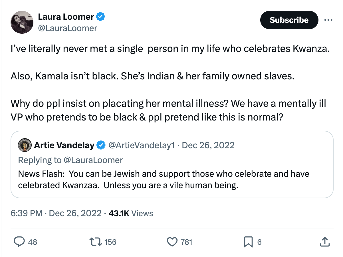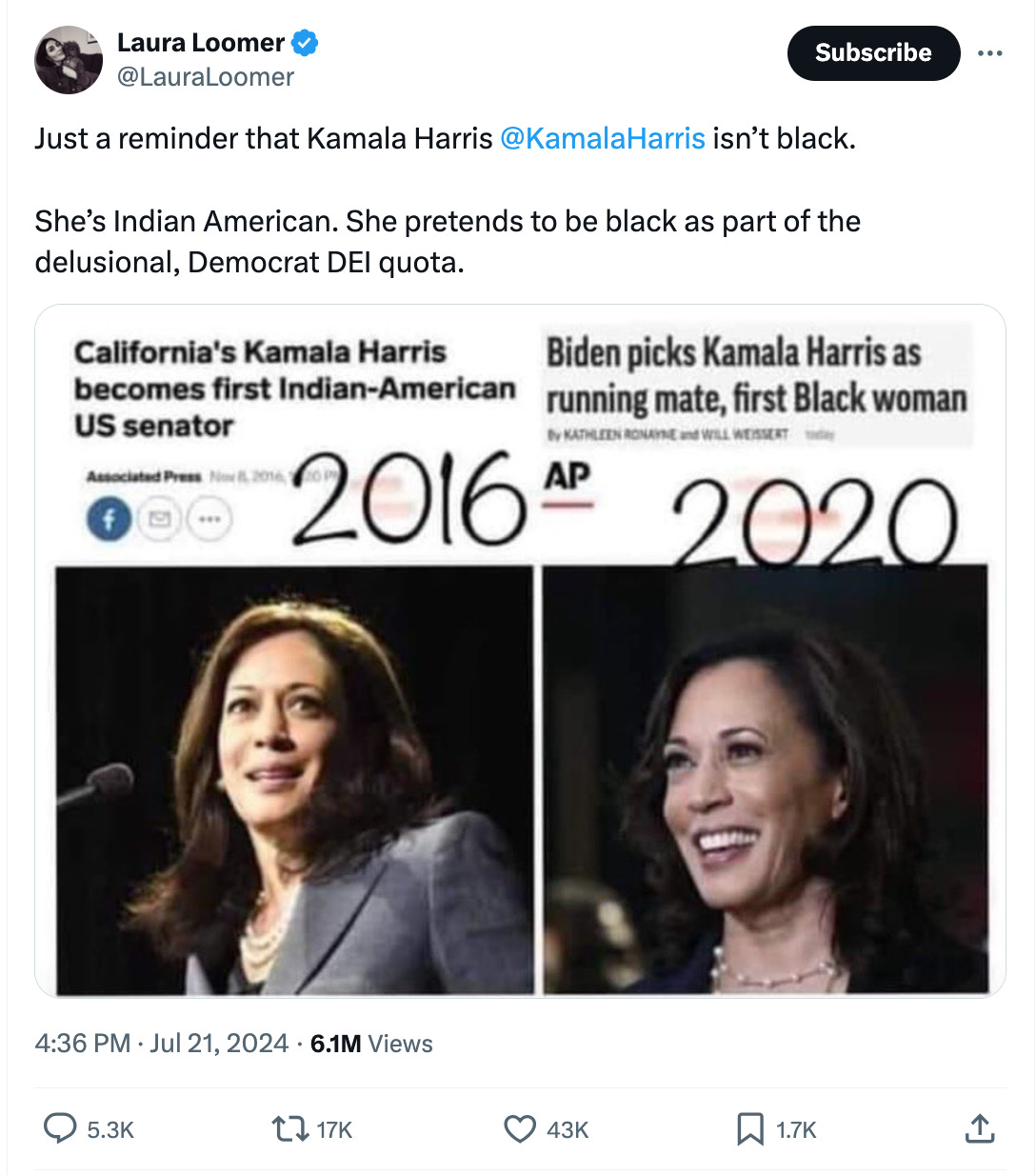Since at least December 2022, Loomer has repeatedly claimed that Harris is not Black. Harris is multiracial, born to a Black father from Jamaica and an Indian mother.