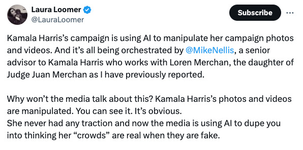 Loomer was not the only one promoting false claims about the Harris campaign using AI to make its crowds seem larger. But she was one of the earliest and most strident, making her first post on X about the Detroit rally on August 9.
