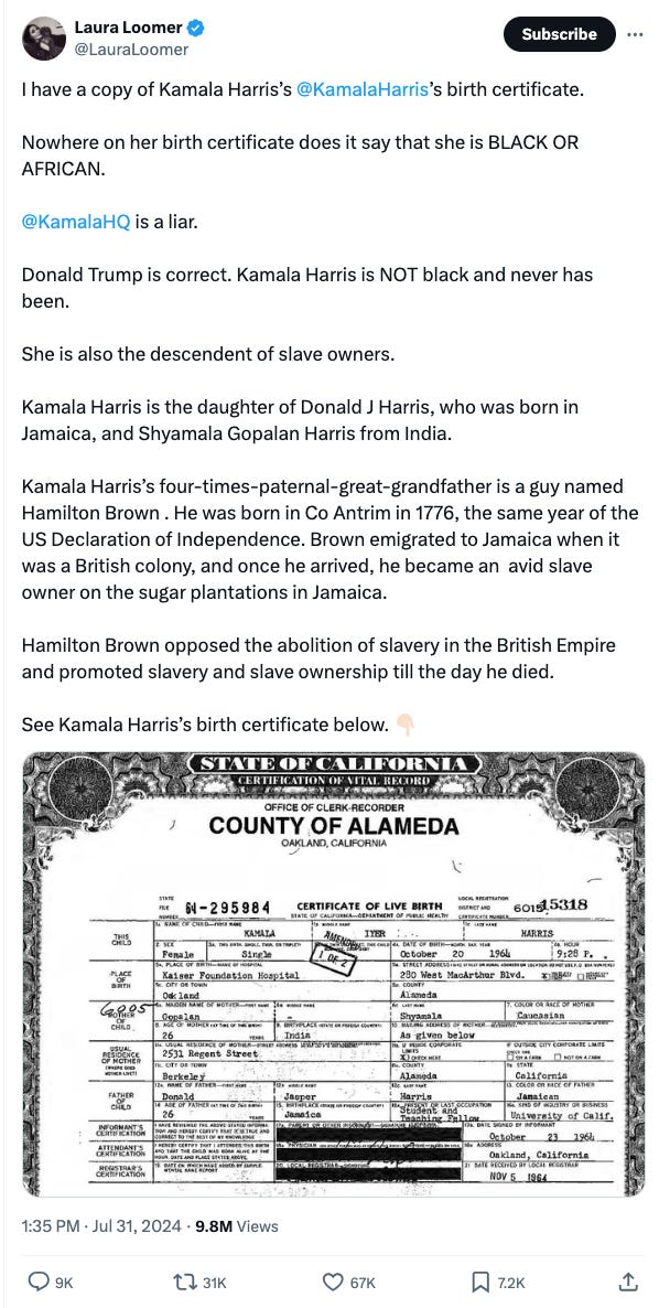 Shortly after the NABJ interview, Loomer tweeted that she had a copy of Harris’s birth certificate, alleging that the document proved that Harris is not Black because the race of her father was listed as “Jamaican” and not “Black” or “African.”