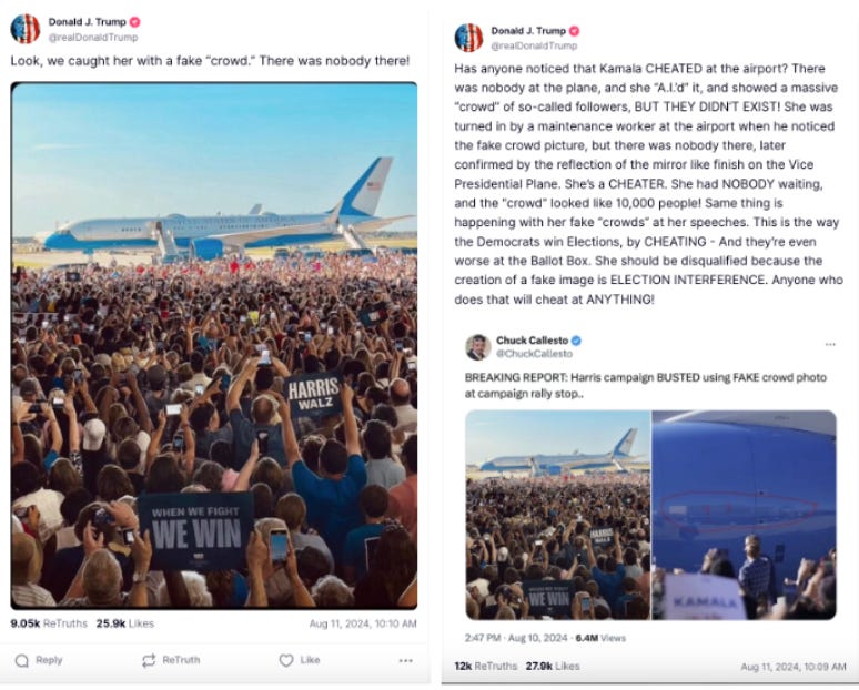 After a Harris rally in Detroit on August 7, talk began to circulate in right-wing media circles that photos of the crowd had been enhanced using AI to make an actually empty rally look fuller. This is false, as several videos and live newscasts show a large crowd.