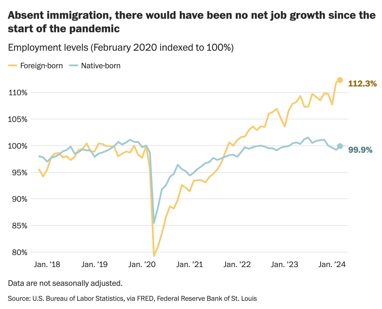 Since February 2020, there has been no net job growth among native-born Americans. One reason is that the native-born workforce is flat or shrinking. Baby boomers are retiring, and birth rates remain low. But there has been substantial job growth in the US since February 2020 because more immigrants are working.