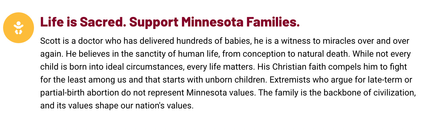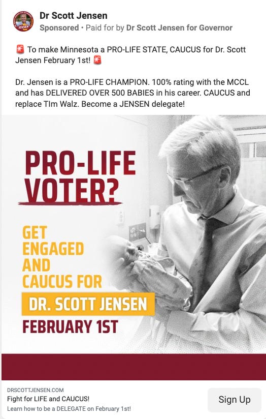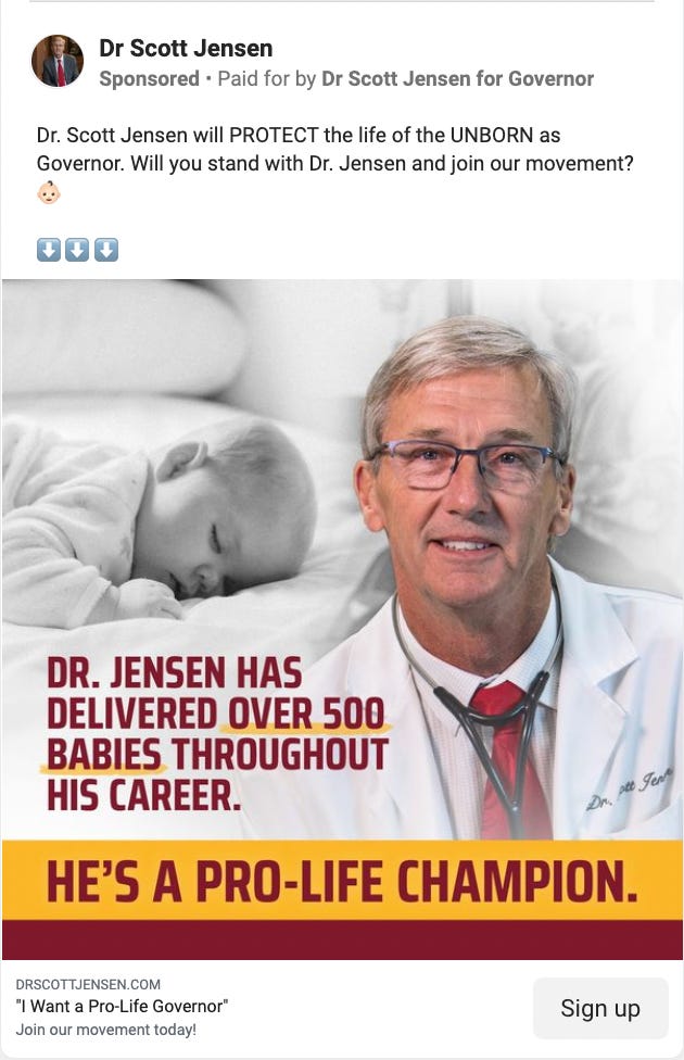 A campaign ad that ran on Facebook in March and April 2021 pledged that "Dr. Scott Jensen will PROTECT the life of the UNBORN as Governor" and described Jensen as a "PRO-LIFE CHAMPION."