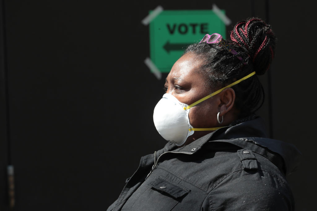 A resident waits in line to vote at a polling place at Riverside University High School on April 07, 2020 in Milwaukee, Wisconsin. (Photo by Scott Olson/Getty Images)