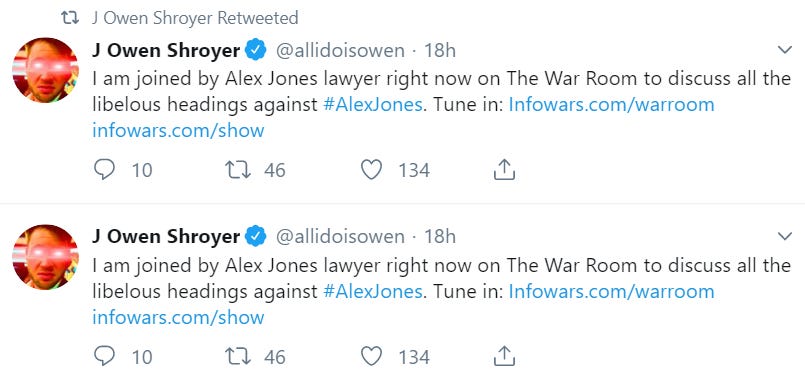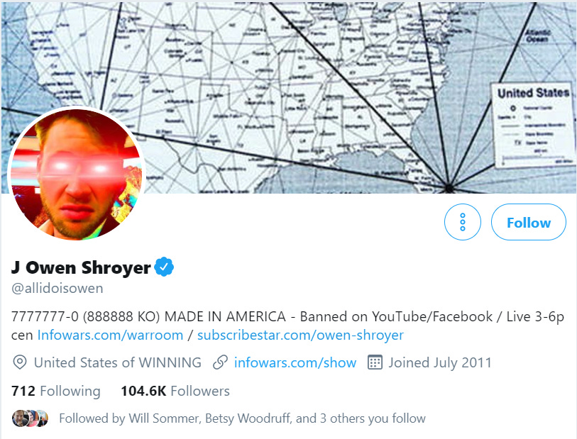 As evident from those tweets, Shroyer also uses his account as a way of promoting Jones and Infowars on Twitter.