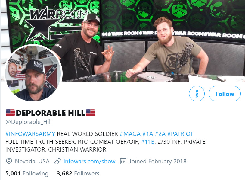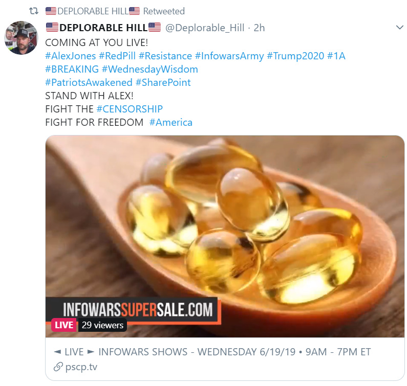 "Deplorable Hill" has visited Shroyer on his set and uses his account to promote Jones and InfoWars. Hill even livestreams InfoWars' show using Periscope broadcasting tool.