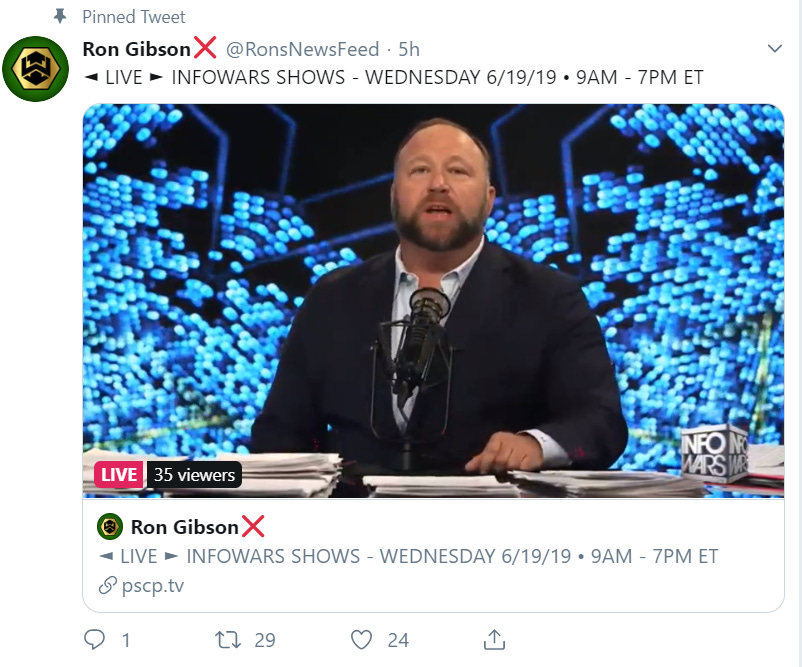 There is a network of accounts that stream InfoWars content on Periscope. The first line of the Twitter account for "Ron Gibson" is "Feeds From Infowars.com."