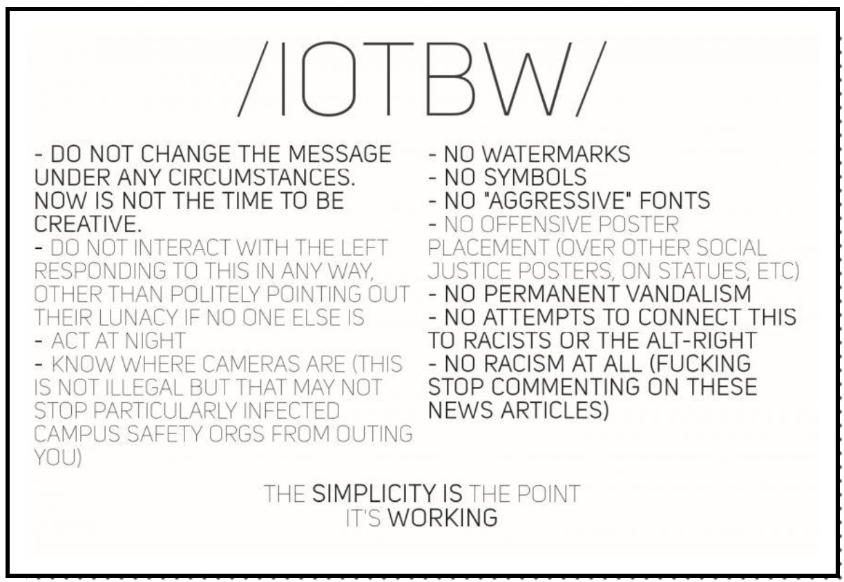 Brian Friedberg and Joan Donovan, researchers at Harvard's Shorenstein Center, documented how the campaign to inject IOTBW into the national consciousness through fliers was highly organized. The leaders of the campaign "spread instructional images on 4chan" which "acted like a style guide, specifying that the memetic flyers be simple, with black letters on a white background, and must not contain any additional advertisements for white supremacist groups, websites, or communities, should not attribute authorship or include links to 4chan."
