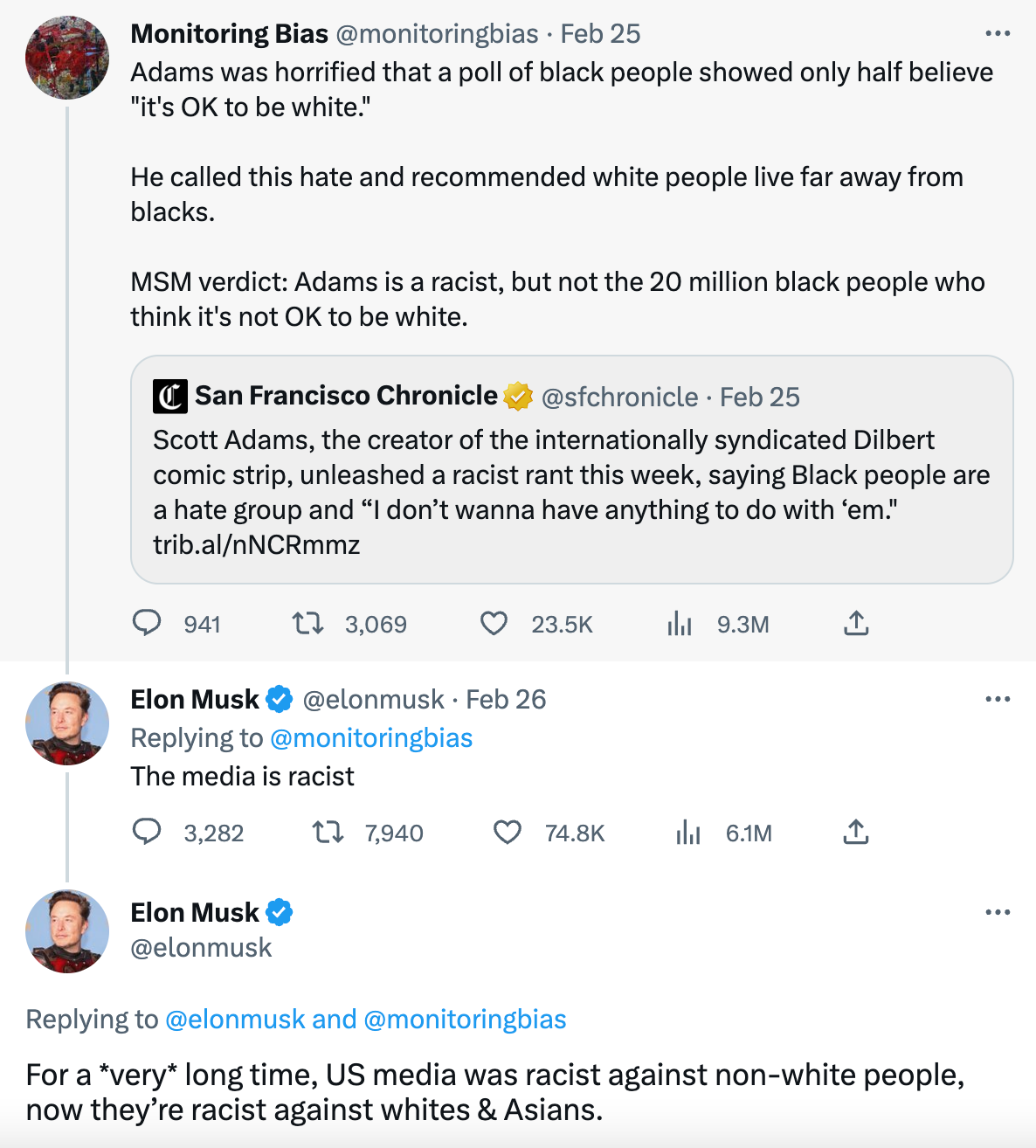 Adams' rant in response to the Rasmussen poll was so racist, few people were willing to come to his defense. One exception is billionaire and Twitter CEO Elon Musk. After Adams was dropped by a slew of newspapers, Musk said it was evidence that the media is "racist against whites." Musk was responding to — and agreeing with — a tweet that said the media should report that millions of Black Americans who declined to endorse IOTBW are racist.