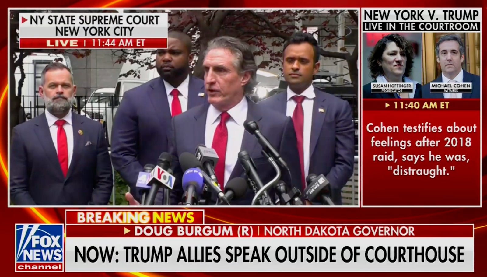On Monday, Senator J.D. Vance (R-OH), Congresswoman Nicole Malliotakis (R-NY), and Senator Tommy Tuberville (R-AL) addressed the media in front of the courthouse. On Tuesday, House Speaker Mike Johnson (R-LA), North Dakota Governor Doug Burgum (R), Congressman Byron Donalds (R-FL), former presidential candidate Vivek Ramaswamy (R), and Congressman Cory Mills (R-FL) did the same. Tuesday's group, in an apparent show of solidarity, wore Trump's signature blue suit and red tie.