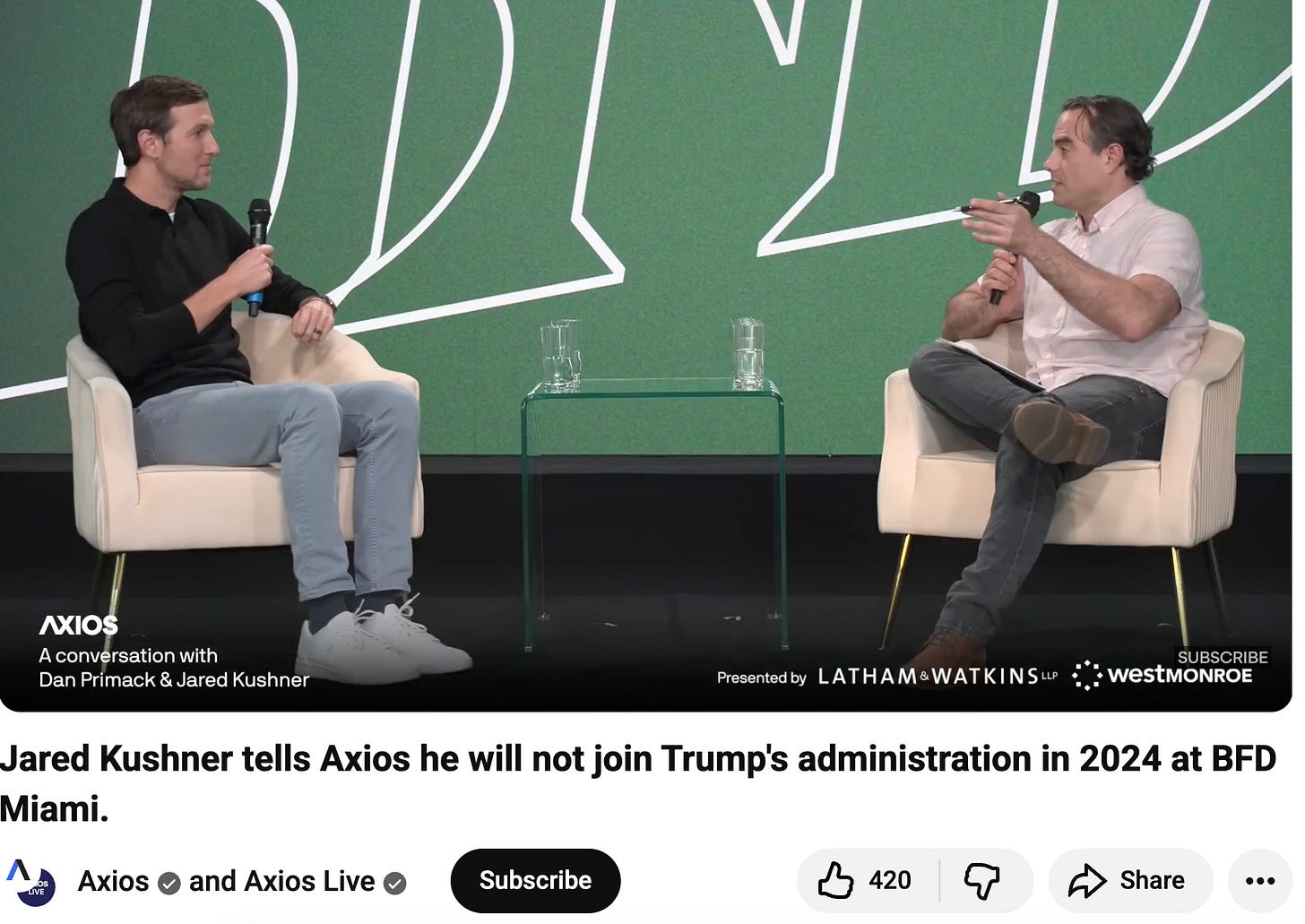 In February 2024, at an event hosted by Axios, Kushner was asked whether accepting billions in investments from Middle Eastern governments would make it “very difficult… to do any sort of foreign policy work” in a second Trump administration.