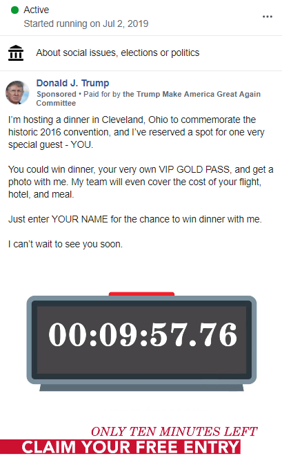 On Tuesday and Wednesday, the Trump campaign ran an ad claiming there was only "10 minutes left" to enter a contest for a dinner with Trump later this month. The ad ran for more than 12 hours.