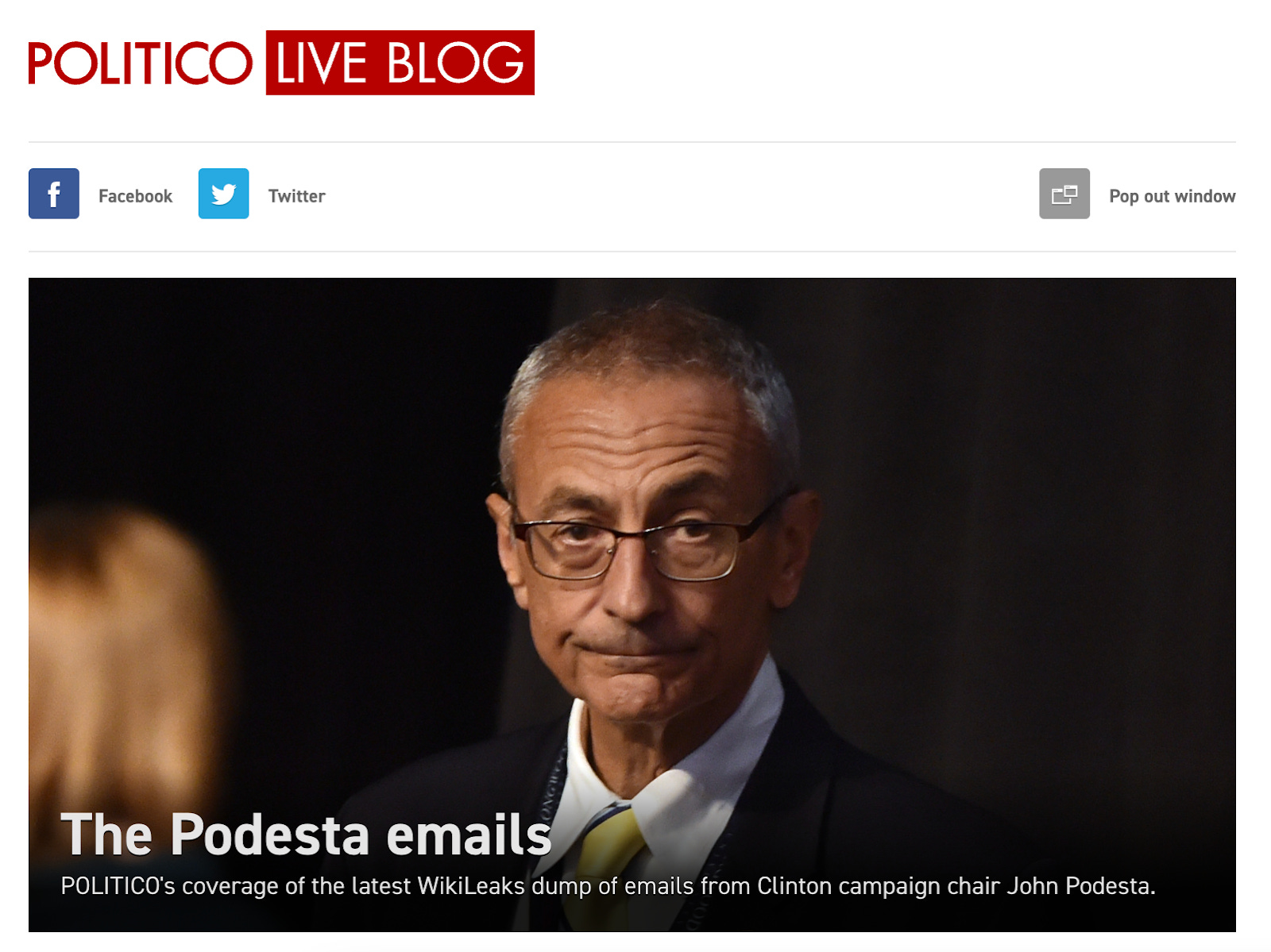 Politico made a different judgment in 2016. In addition to numerous standalone articles about the hacked materials from the DNC and Clinton campaign officials, Politico published a "live blog" to highlight the minutiae in the stolen emails.