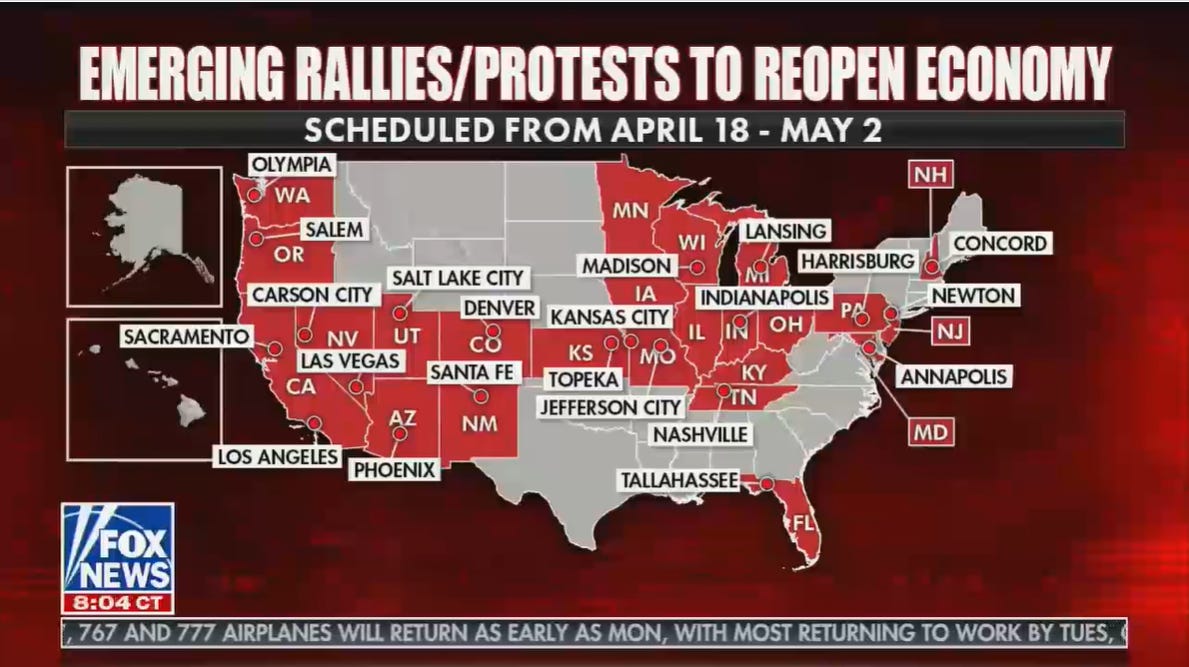 That's where Fox News comes in. The network is systematically raising the profile of the protests. The April 18 edition of Fox & Friends included this map: