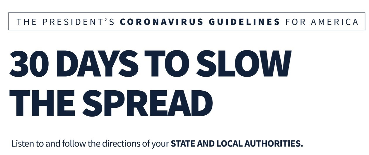On April 2, Trump announced his "30 Days To Slow The Spread" initiative. Among other things, the guidelines instruct people to avoid "discretionary travel, shopping trips, and social visits," and "eating at bars and restaurants." Beyond the federal guidelines, Trump says everyone should "Listen to and follow the directions of state and local authorities."