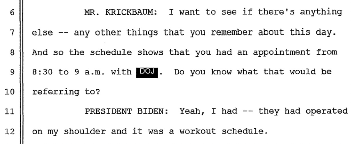 At other times, Biden demonstrated a remarkable recall of the most mundane details of his schedule as Vice President. At one point, one of the prosecutors working with Hur asked Biden if he remembered the purpose of an appointment on his calendar from 8:30 to 9 AM on February 16, 2017. Biden responds that it was a physical therapy appointment for his shoulder.
