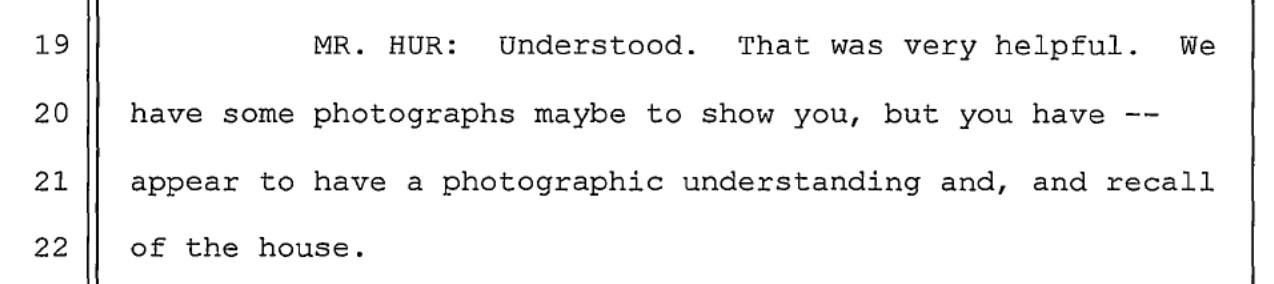 While Hur said that Biden had a "poor memory" in his report, during the interview, he remarked that Biden had a "photographic understanding and recall" of the layout and contents of his lake house in Wilmington, Delaware.