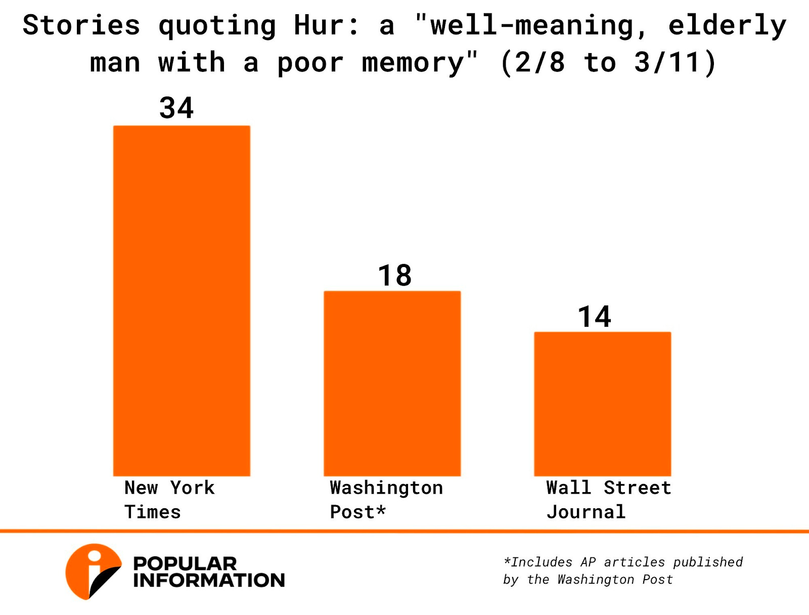 In the days that followed, the nation's most prominent media outlets described the report as "a political disaster," "a political nightmare," "damning," and "a devastating portrait of an 81-year-old president," among other things. Few of these articles mentioned that Hur, a lawyer, was utterly unqualified to make judgments about Biden's memory, which requires medical expertise. Between the release of the report on February 8 and March 12, the New York Times, Washington Post, and Wall Street Journal included Hur's assessment of Biden (a "well-meaning, elderly man with a poor memory") in 66 separate articles, collectively.